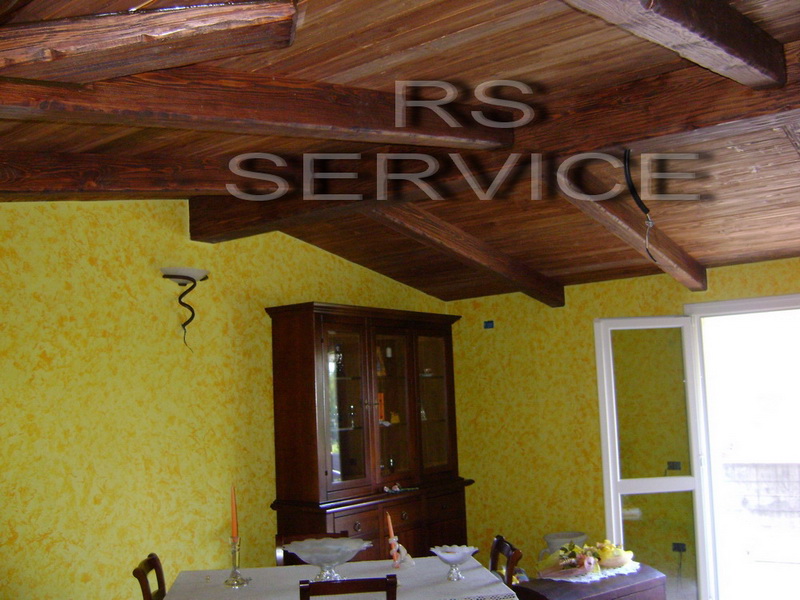 adesso un bel controffitto in legno,composto da falsitravi in legno cavo e perline di spessore 20 mm anticate e spazzolate.